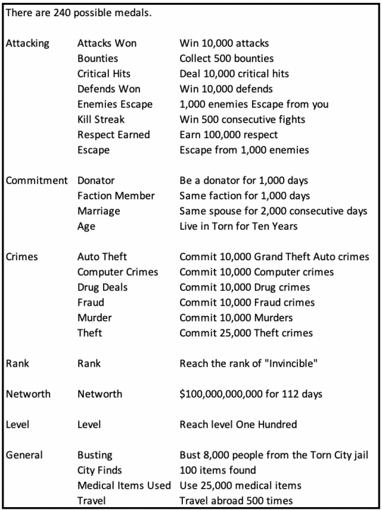 Has anyone wondered what a lifetime achievement in Torn would look like? I could see it being given to those special players who have earned all 240 in-game Medals, among which are some of the long term medals that take years of activity and dedication to achieve. In fact, you can’t even get all the medals unless you have been here for 10 years, reached level 100, and held $100b for 112 days. And those are just the minimum among many other achievements that are outstanding by themselves.