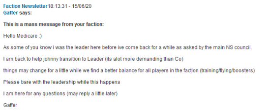 This obviously never happened, and a newsletter sent out by JohnnyGreed sums up the feeling within their camp. Stretch, the leader of Medicare's parent faction NS, told The Times that JohnnyGreed was never promised leadership, and he only took charge due to the previous leader going missing for a month. Stretch says the reason for this rebrand was that Medicare simply wasn't working out for them as an inhouse revive faction.