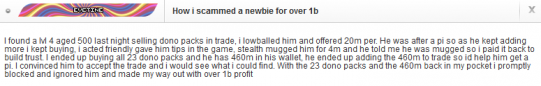 Apparently, our offer of a DP for the FHC was not enough to persuade him to trade, as Andfromthen accepted the item without putting it on his little list. FINE, WHATEVER. But we weren't the only ones annoyed with this player, as h3110 got in touch with us to claim he stole his idea - even though the whole thing is based on an existing real-life concept.
