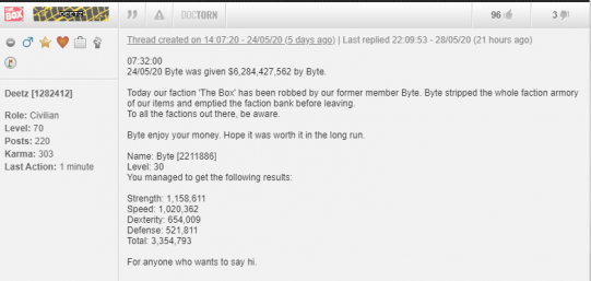 This time last month the HoF faction The Box was $6,284,427,562 better off than it is today. On the 24th of May, one of their members, Byte, cleaned out their vault and stripped their faction armory of over $2 billion worth of items before high-tailing out of there. A forum post by Deetz of The Box alerted the community to this theft shortly after it happened, and in doing so, he added another name to the list of infamous vault scammers in Torn City history.