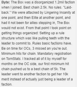 "The Box was a disorganised 1.2mil faction when I joined. Best chain 2.5k. No rules. "Laid-back." We were attacked by Lingering Insanity at one point, and then Elite at another point, and had it not been for allies stepping in, The Box would not exist. From that point, I took point on getting things organised"