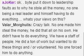 Valar_Morghulis rejects Byte's reasoning entirely, describing his comments as "just more crazy talk trying to justify his dirtball actions after the fact." He made the point that nobody forced Byte to stay in The Box and that he wasn't forced to do any particular work.