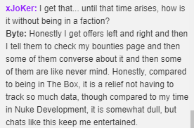 No one single member makes a faction, but that doesn't mean that Byte wasn't doing a disproportionate amount of work for The Box while he was there. Without knowing the ins and outs of the faction, we cannot say for certain whether he did indeed toil away to no appreciation. But even if Byte did have legitimate grievances with the way The Box was run, that is no reason for him to punish the entire faction by stealing their hard-earned cash and items. When we asked Byte if he was capable of doing such a thing again, he gave the following response.