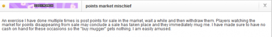 _Santa_Claus_ even posted about his magnificent achievement in the Achievement forum before he'd even achieved it. The only trouble is, his plan was utter bo***cks. For a start, the pawn shop price doesn't automatically rise or fall based on the price at which points are listed, but on the price they sell at. You can list a bunch of points at extortionate prices if you want, but this will do diddly squat to what Felix the pawn shop guy pays - he's no fool you know.