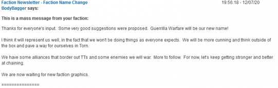 Last month the Torn City Times heard that Bodybagger was planning to purchase a high respect faction with the aim of creating a faction of giants. Bodybagger, Torn's strongest player, later purchased the Scorched Earth faction from Realist, renamed it to Guerilla Warfare, and installed himself as leader - Realist is now co-leader.