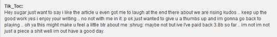 Bish was one of the players he repaid, and this led him to create a forum thread praising Deimos for his actions. Fellow UR members Jiren and Gadzt were also reportedly repaid the money they had stored in the faction vault. We don't know what happened to the rest of UR's vault money because sadly, Deimos, aka Tik_Toc, would not talk to the Times for reasons we cannot discern. Our best guess is that we accidentally accused him of containing Chinese spyware.
