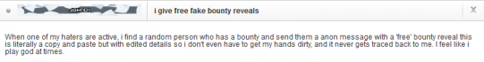 "I kept his name out of the thread in achievements until yesterday, but seeing as the bounties hadn't stopped since the mug, I felt no obligation. I spoke with him yesterday and he told me that the bounties aren't him, his personal stats confirm this, although its easy to have someone else place anonymous bounties for you. He says he's not doing that either, so who the mysterious bountier is will remain a mystery." - Untouchable