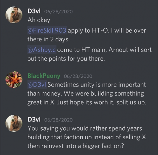 "I know a lot of HTx was upset about the sudden sale, they were not given any advance notice and simply told to move to HT and HTO. Many did not. Several bigger hitters joined Malcky_420’s faction and based on the name it looks like an attempt to rebuild a former faction, though nobody I have spoken to has heard of Ruthless before."