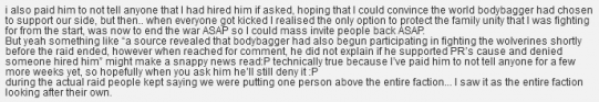 "Wolves leadership knows this, so I find any mention of this Raid being deserved due to a minority of us potentially selling bountyslots utterly absurd, because they endorse doing it on their own members. (When Larry offered me his services I refused)."