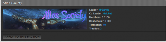 A post by Softrising on August 10th announced the existence of a peace treaty between the two sides, told Sharkeyfive he was welcome back if he ended his grudge, and called for Phoenix Rising's 80+ members to return to the faction. Their membership tally stood at 38 when I checked earlier this week, but this morning I was shocked to discover that Phoenix Rising was no more, with the faction having been renamed to Atlas Society, a group currently led by MrSands.