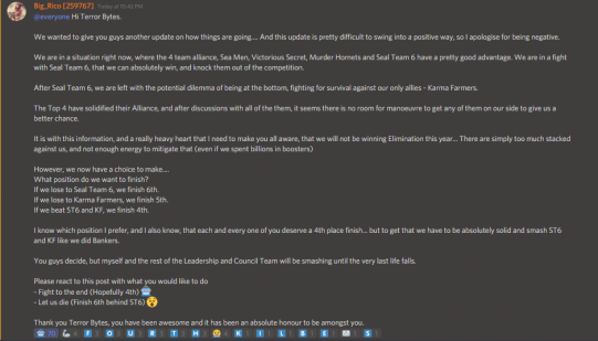 A screenshot from Discord shows that Terror Bytes leadership realised they were done for as soon as Seal Team Six and Murder Hornets jumped ship. Their leaders should be commended for rousing their members to fight for fifth place as well as they did, despite knowing they couldn't finish much higher.
