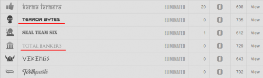 Seal Team Six clubbed after betraying alliance. Terror Bytes suffer fatal exception error. Karma Farmers enter Nirvana. Hornets allow themselves to be swatted. Read our final Elimination gossip column