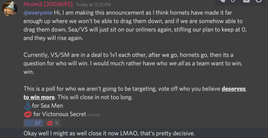 Our final three is now confirmed as Sea Men, Victorious Secret, and Murder Hornets. Given that the latter two have been allied from the start, you could be forgiven for thinking that the final two is a foregone conclusion. And you would be right to think that, based on this Discord screenshot from earlier today.