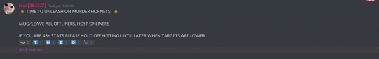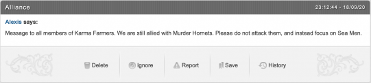 In the midst of battle, some Murder Hornets tried to muddy the waters by posing as Karma Farmers and messaging their members with false attack instructions. The impersonation of an enemy combatant through use of their insignia is an explicitly prohibited Ruse de guerre under article 23 of the Hague Convention of 1907. But thankfully, the international rules of engagement do not apply to Torn City, so Alexis will not be executed for war crimes just yet.