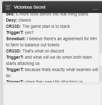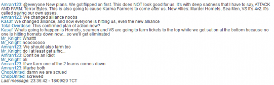 But will both VS and Sea Men hold their nerve and wait for a fair fight? Or might one team crack and try to surprise attack the other by teaming up with Hornets before they are eliminated? I find such a scenario improbable, but not entirely implausible. Indeed, some VS members were getting very nervous about the gap between the two teams just before the defeat of Karma Farmers was confirmed.