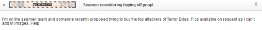 A member of a rival team, most likely a Karma Farmer, has tried to cause a last-minute rift between Sea Men and Victorious Secret by pretending to be the former and putting a bounty on the latter. This attempt was about as believable as Prince Andrew when he claimed he couldn't possibly have been a damp paedo because he cannot physically sweat.