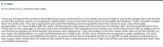 B_A, formerly Barry Allen, was not impressed with MightyGoober's post-defeat forum post and feels that he should've made more of an effort to thank his team.