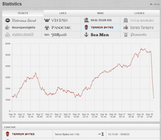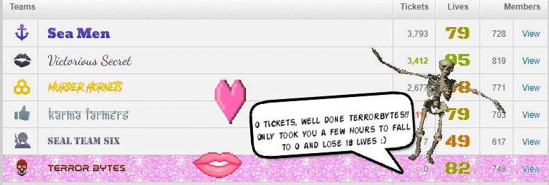 The Terror Bytes were the only team to have avoided a life loss when their first was taken at 3.15 on Saturday. And in an impressive show of force from their rivals, their 100th and final life was pulled from their robot hands at 21:15 the next day, just 42 hours later. Heretic of Total Bankers produced a delightful gif to celebrate Terror Bytes fall, accompanied by a lovely exchange between herself and Muckamuck to illustrate the friendly rivalry between the two sides.