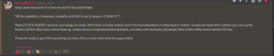That being said, Sea Men and Victorious Secret were both making hits on each other before the Hornets were defeated in an attempt to even up their ticket scores. However, this screenshot from the VS discord shows that a ceasefire was soon agreed to allow both sides to prepare for a fair fight. But a comment by Kuro in the forums suggests that VS spent too much energy on the Hornets head of their inevitable showdown with Sea Men.