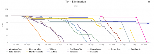 Both teams kept their word, and from a platform of 50 lives, the Murder Hornets were brutally exterminated over the course of twelve hours by their rivals. When the last Hornet was killed off at 5:15am on the 22nd, Victorious Secret held a healthy lead of sixteen lives over the Sea Men, with 95 lives compared to the spaff-captains' tally of 79.