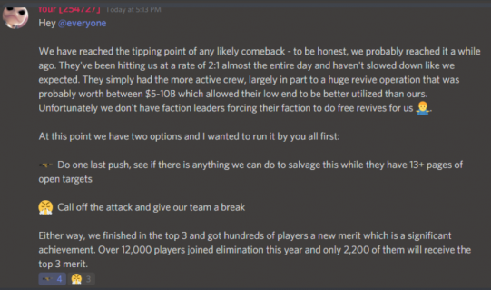 As the day wore on, this chat screenshot indicates that VS was maintaining only 400 hits per hour compared to their opponents' 1,000. Many in the VS ranks complained that they were rolling over for their opponents, and this stream of Discord messages shows that the mood in their camp was not good as wave after wave of Sea Men lashed upon them