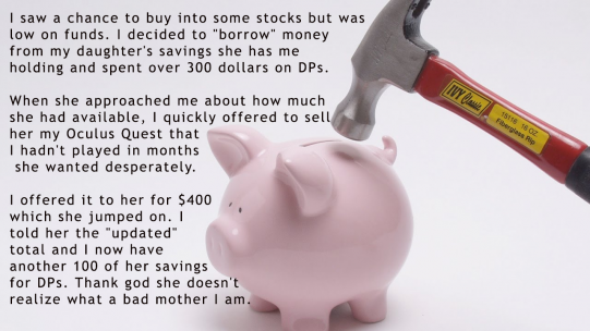 This is your future if you do not act fast. You did not sell your Oculus Quest to your daughter, you gave it to her. She now has $400 invested in the bank of mom. You will inform her of this, while simultaneously revealing that her funds cannot be accessed until she is 45 years old. This is the Lord's will, for it shall ensure she retains her internal organs well into adulthood.