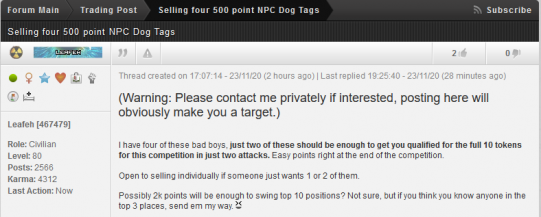 The main fight seems to be between those in fifth to ninth, as just 2,930 points separate these positions, with some players only a few hundred points behind their nearest competitor. This gap could easily be bridged if anyone wants to take up Leafeh on her generous offer to sell the four 500 point NPC tags she has in her possession. In fact, so valuable are these tags, that just two of them may be enough to get a tagless player the full total of 10 competition tokens.