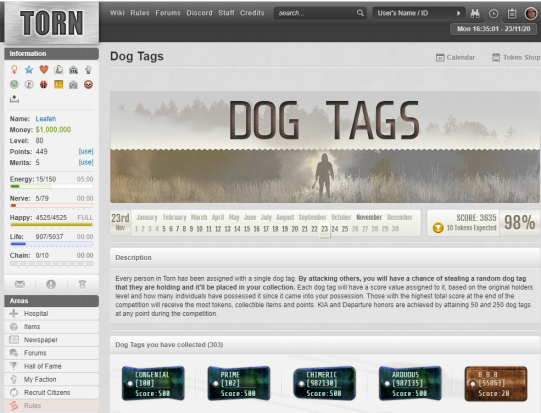 Penicillin has won the Dog Tags tournament for the second year running after finishing with a score of 42,682 points. Astonishingly, this is the exact same score he recorded last year when he set a new Torn record. Congratulations Penicillin on a well-deserved victory!
