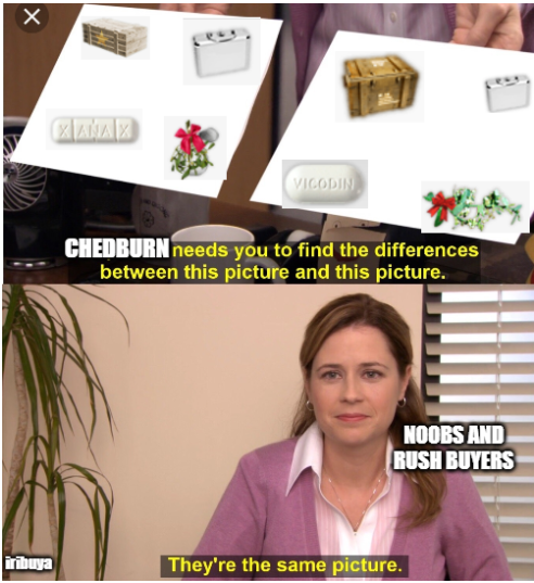 "Pawn got adjusted again. I still don't know why, because there is only one reason the market value is so close to pawn. I'll get some drama from one specific faction for saying this; probably good for Chedburn's retirement plan if he changes the image on Grenade Packs OR Donator Packs to not look similar. On another note, players should learn to read warnings or buy glasses if they have a hard time finding the difference." - iribuya