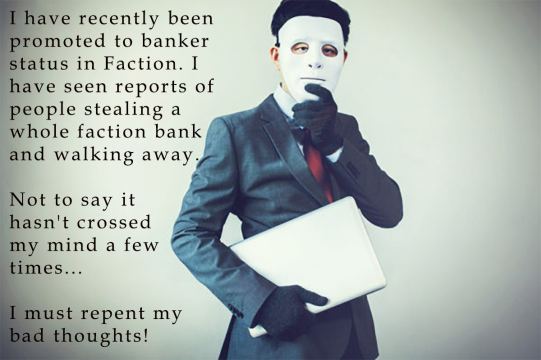 "I have recently been promoted to banker status in Faction. I have seen reports of people stealing a whole faction bank and walking away. Not to say it hasn't crossed my mind a few times...I must repent my bad thoughts!"