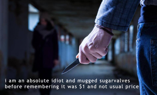 "I am an absolute idiot and mugged sugarvalves before remembering it was $1 and not usual price."
