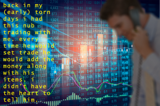 "Back in my (early) torn days I had this nub trading with me. every time he would set trade he would add the money along with his items. I didn’t have the heart to tell him."
