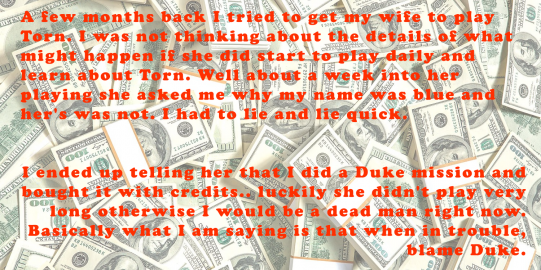 "A few months back I tried to get my wife to play Torn. I was not thinking about the details of what might happen if she did start to play daily and learn about Torn. Well about a week into her playing she asked me why my name was blue and her's was not. I had to lie and lie quick. I ended up telling her that I did a Duke mission and bought it with credits. Luckily she didn't play very long otherwise I would be a dead man right now. Basically what I am saying is that when in trouble, blame Duke."