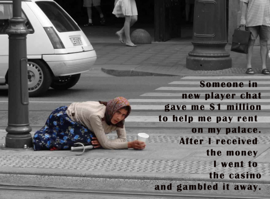 "Someone in new player chat gave me $1 million to help me pay rent on my palace. After I received the money I went to the casino and gambled it away."