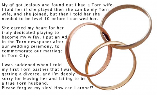 "My gf got jealous and found out I had a Torn wife. I told her if she played then she can be my Torn wife, and she joined, but then I told her she needed to be level 10 before I can wed her. She earned my heart for her truly dedicated playing to become my wifey. I put an Ad in the Torn newspaper after our wedding ceremony, to commemorate our marriage in Torn City."