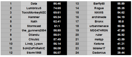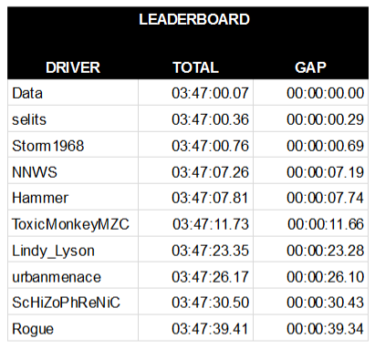 Just 0.40 of a second behind selits is Storm1968, who has won two races already this tournament. Storm's DS of 56 is good enough for 12th ranking overall, but his early tournament form has shown he has the ability to go toe-to-toe with the very best. Outpacing Data over nine races is a difficult ask, but Storm has given himself a great chance of doing exactly that.