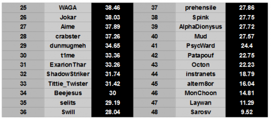 urbanmenace: Grabbed third place at Convict. Consistently good so far. Current Position: 8th. RS Tournament Rank: 18th.