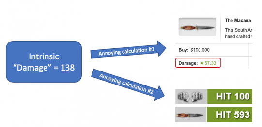 The way these values are calculated is complicated, but you can read precisely how it's done here. To use the example of the Macana, its Intrinsic Damage value is 138, but the value displayed as its visible Damage Stat is just 57.33. When we want to know how much a weapon truly hurts someone, it is the Damage Multiplier we need to calculate.