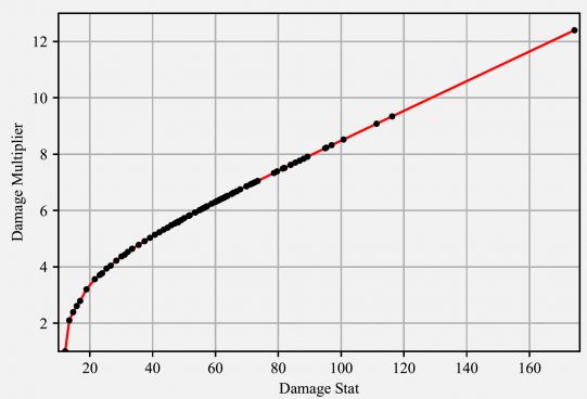 In this example, my Macana's Damage Multiplier is 5.93. This means that if you were dealing 100 damage with your Fists to your opponent, you would deal 593 damage with this particular Macana. Below you can see a graph that shows how the Damage Stat displayed on a weapon relates to its eventual Damage Multiplier.