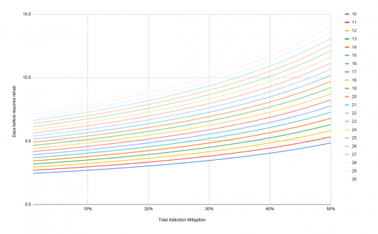 WIth 10 merits in addiction, a player whose director requires rehab at 10 addiction can only go an additional day and a half(3.5 vs. 4.8) without rehabbing. In contrast, a player whose director requires rehab at 30 addiction can go an additional 4 days(10.4 vs. 14.5) without rehabbing. These are the two most extreme cases, so most players will fall somewhere in the middle.