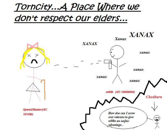 It was towards the end of my first stint in Torn that drugs were introduced - yes, there was a time before them. Suddenly, there was this spike of rich, strong n00bs. It seemed to happen so quickly, and not everyone was happy.
