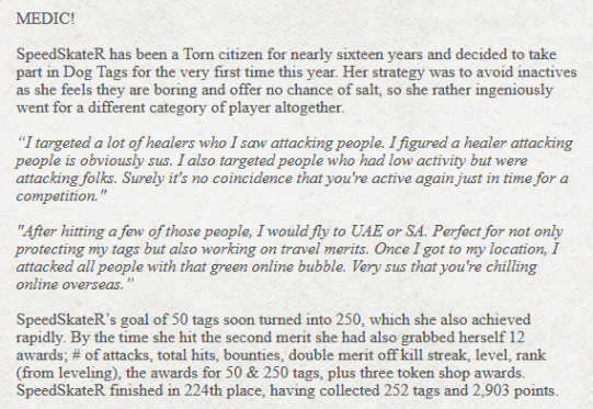 Perhaps the addition of ranked warring will bring back those intense rivalries and a desire to act on them. I think we recently saw a glimpse of the chaos that can unfold with the breakout of wars that led up to Valentine's this year. I'm hoping to see a much more blood-thirsty Torn with these much-anticipated changes and perhaps the awakening of a sleeping giant or two. Torn really thrived on the brother/sisterhood of factions and their vendettas in the old days. I was 100% all-in, even at the expense of my own personal gains.