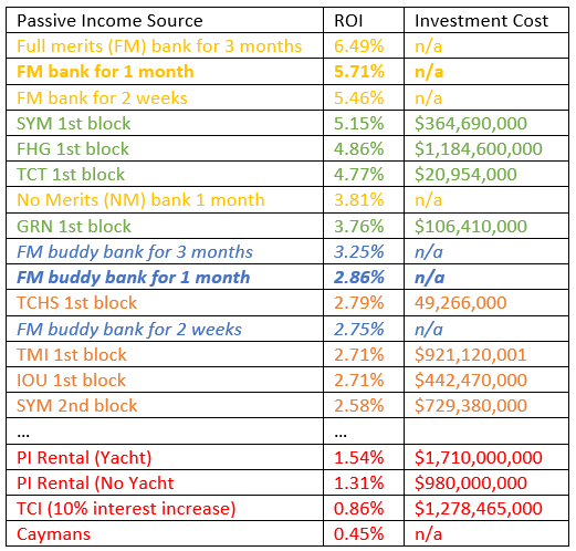 If you look at the nice color coding, it's clear that your own bank with full merits is the best passive earner in Torn - it's more than twice as effective as others, in some cases. This is why Buddy Banking is such a good idea, especially if you can negotiate a more aggressive cut of the interest with your associate!