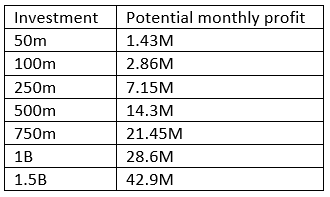 Although some financial advisors prefer to use “Days to Break Even” or APR as a way of calculating the value of their investments, I prefer to look at the monthly return on investment, or ROI as it will be referred to moving forward. Say you were to invest $100m into one method, and it had an average ROI of 1%, conceivably it would generate $1m of profit every month. I find that using this metric makes it easy to compare investments across banks, stocks, and other ventures.