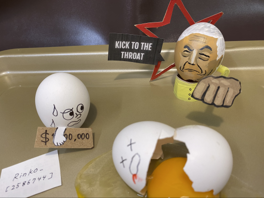 Rinko_'s entry stood out due to the artistic ability demonstrated in their painting of the Leslie egg, replete with three-dimensional fist. This effort may not have depicted any current events, but it did represent something that happens on a daily basis to many unlucky Torn citizens. Sadly, no proof was offered of the raw egg being eaten, which would've been lovely and disgusting.