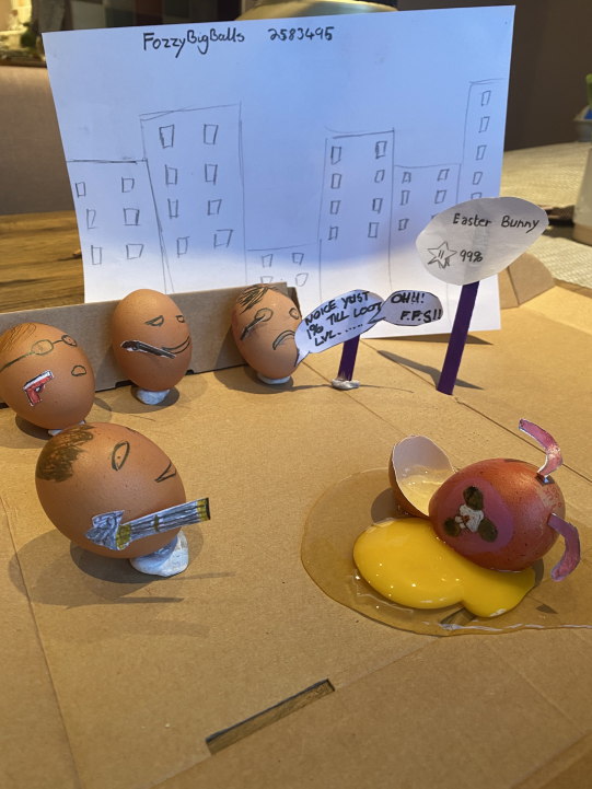Fozzy's background drawing of a cityscape may leave much to be desired, but this one beat off others to third place thanks to their depiction of the Easter Bunny. One well-painted egg can often be the deciding factor in a competition with only a few pages of entries like this, and so it proved as FozzyBigBalls took bronze.