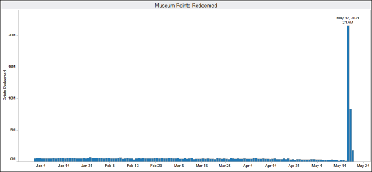 This hourly graph shows that most points were paid out in the first hour of the event. Of the 31 million+ points generated, 9,438,508 were sold directly to the Pawn Shop. Typically, just a few hundred thousand points are pawned every single day, as you can see in this graph. The total cash value of all of the points pawned on Museum Day was $432 billion.