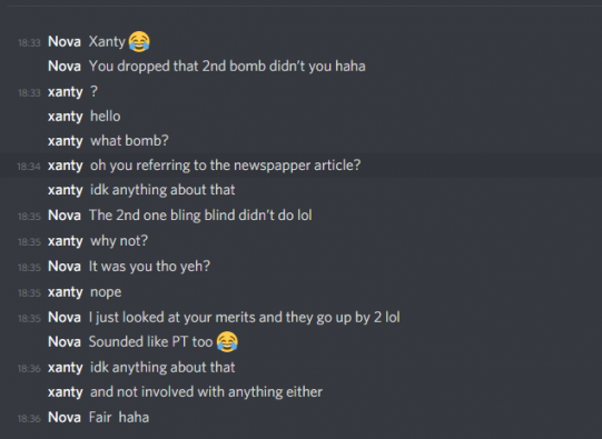 "Xanty's awards went up by 2 on the 18th March and the claims of guesting/thinking Mentos is great sounds like something a PT member would say because they lost a war to Mentos. Is my theory at least, the reasoning and justification of why the bomb was dropped sounds very similar to what PT were saying at the time when they lost."