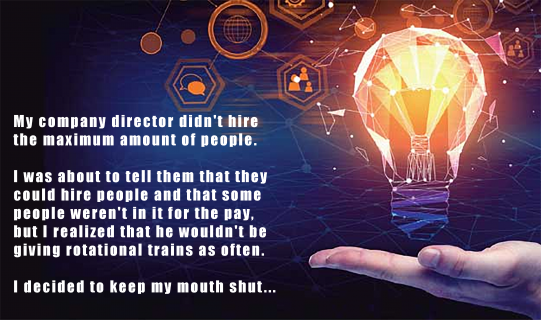 "My company director didn't hire the maximum amount of people. I was about to tell them that they could hire people and that some people weren't in it for the pay, but I realized that he wouldn't be giving rotational trains as often. I decided to keep my mouth shut..."
