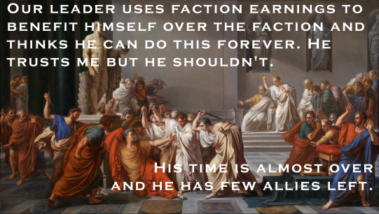 "Our leader uses faction earnings to benefit himself over the faction and thinks he can do this forever. He trusts me but he shouldn't. His time is almost over and he has few allies left."